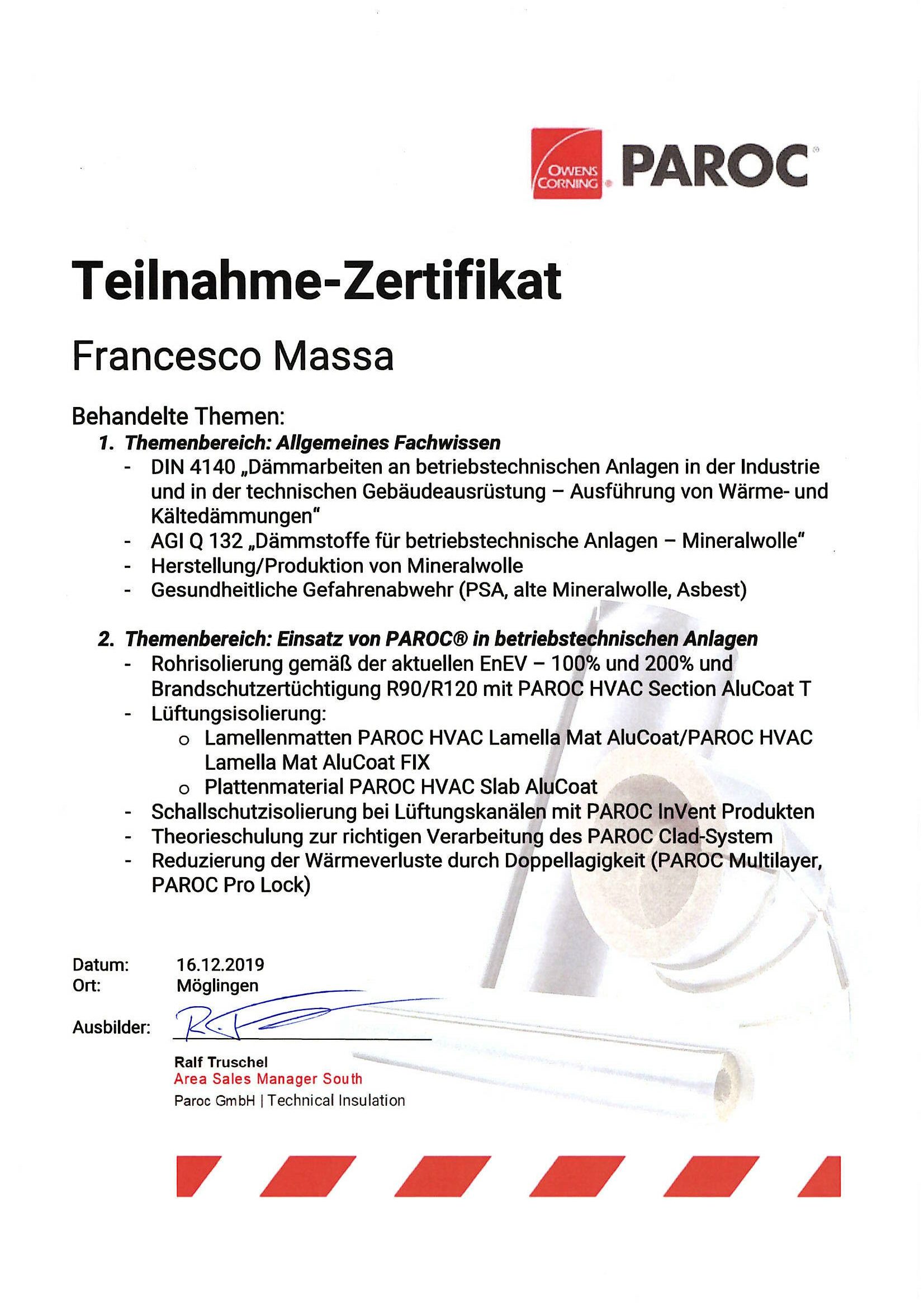Durch die langjährige Erfahrung im Bereich Isolierung haben Francesco gemeinsam mit seinem Vater und seinen Brüdern die Firma aufgebaut. 2016 hat Francesco Massa den Familienbetrieb übernommen und leitet diesen bisher sehr erfolgreich. Durch die stetige Erweiterung der Betriebsfelder kann heute ein sehr umfangreiches Leistungsangebot vorgezeigt werden. Die Firma ist heute auf die Bereiche Kälte- und Wärmeisolierung, sowie Schall- und Brandschutz spezialisiert.